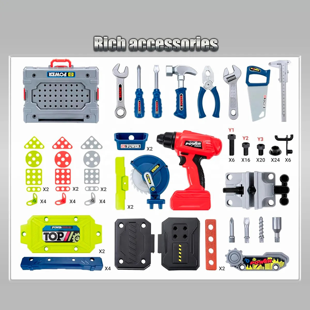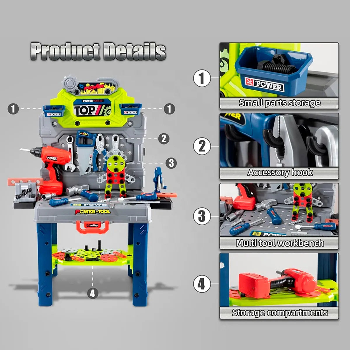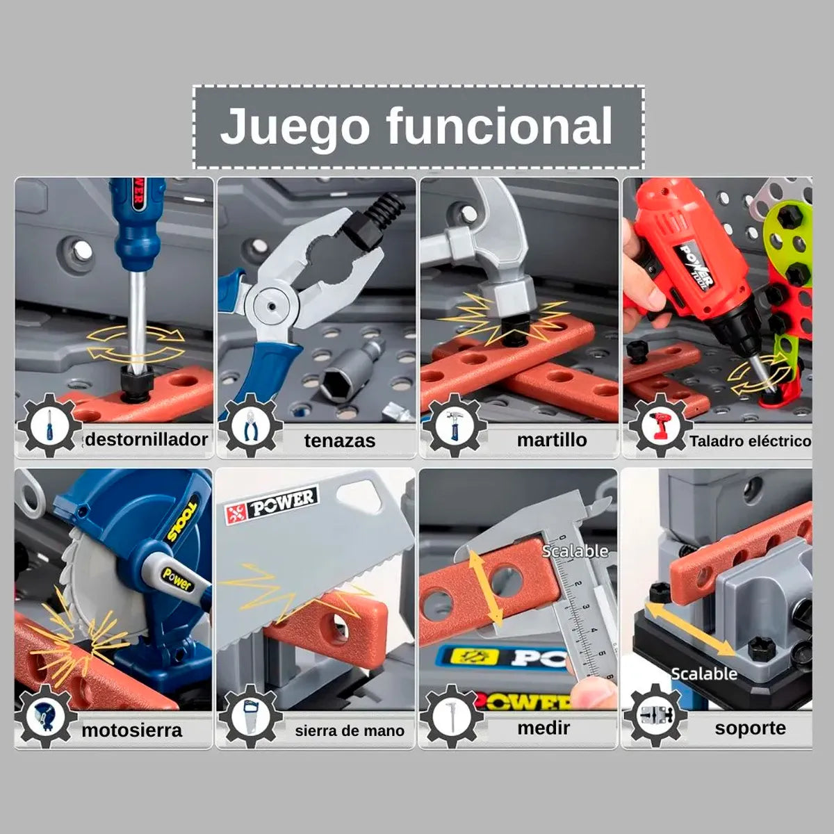 - Incluye herramientas seguras para niños (destornilladores, llaves, tuercas y más).