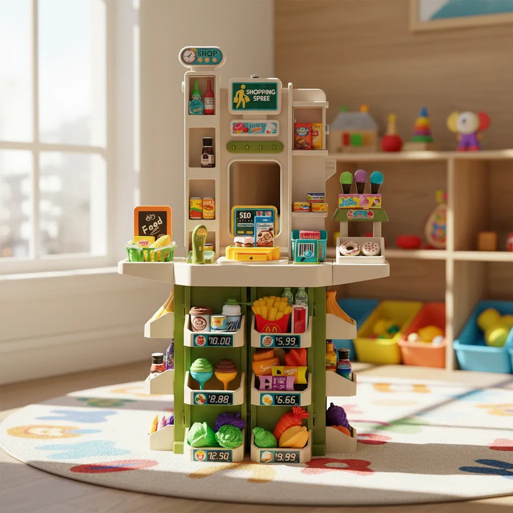 - Set completo de supermercado de juguete con 67 piezas que incluye caja registradora, “productos”, dinero ficticio, carrito/cestas o accesorios de compra.Simulación realista del juego de compras: permite “pagar”, “dar cambio”, organizar productos, “atender” clientes, etc.